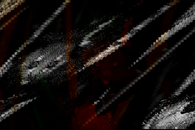 O aiai é um primata africano de hábitos noturnos. Tem olhos grandes e focinho curto e pontudo.