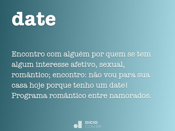 substantivo masculino [Popular] Encontro com alguém por quem se tem algum interesse afetivo, sexual, romântico; encontro: não vou para sua casa hoje porque tenho um date![Popular] Programa romântico entre namorados.[Gramática] A palavra date é considerada um estrangeirismo.Etimologia (origem da palavra date). A palavra date tem sua origem no inglês date, pelo sentido de encontro.